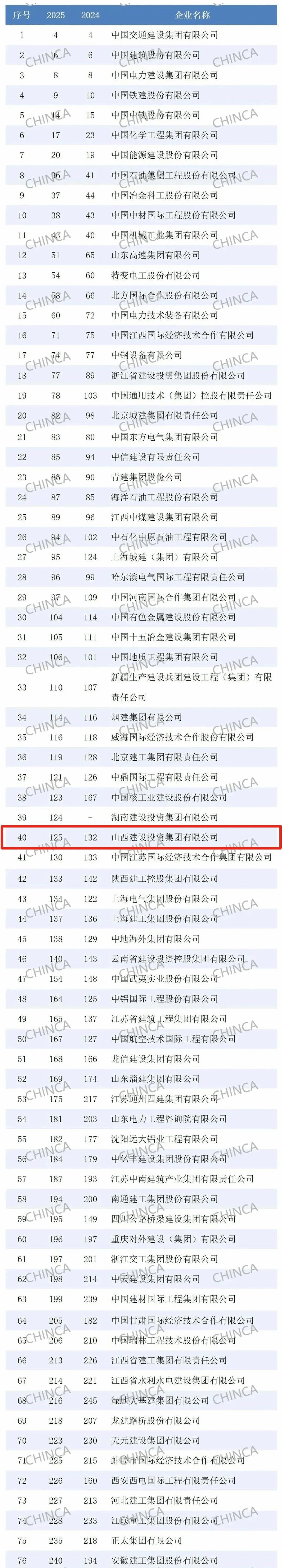 8月21日,美国《工程新闻记录》(ENR)2025年度“全球承包商250强”和“国际承包商250强”榜单公布,山西建投分别位列第13位和第125位,排名较去年提升1位和7位,保持稳步上升态势。