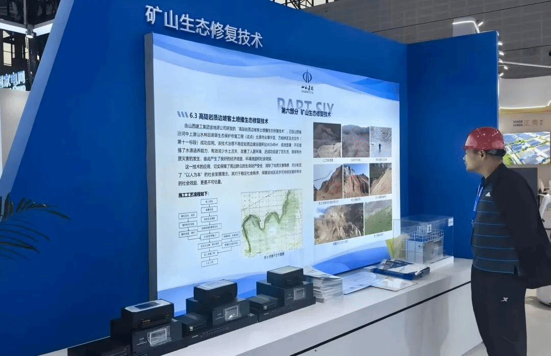 矿山生态修复技术展区,展示了矿建工程设计、排矸场灭火、矿井充填开采等技术。