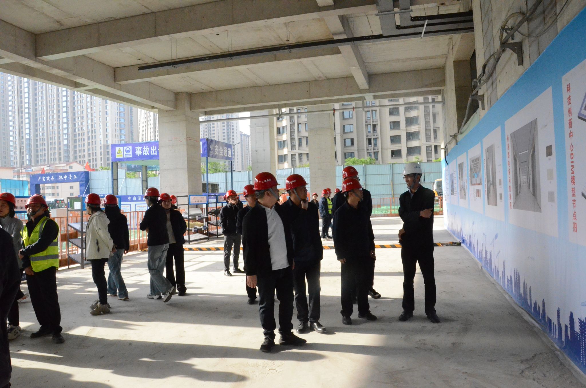 参会人员在会前观摩了科技创新中心项目主体结构、室内装饰装修样板间、室外幕墙样板以及水电管井安装样板等。各专业负责人分别就现场土建、装饰装修和安装工程的特点、难点及亮点进行了详细讲解。观摩人员与现场施工及技术人员进行了深入交流学习。