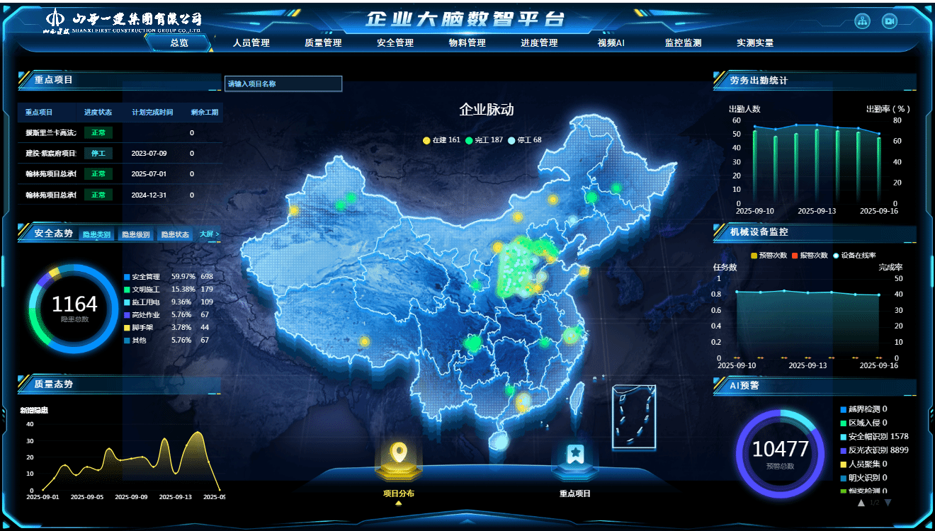 一建集团始终将施工安全作为核心管理目标,2023年完成安全管理系统自主研发并于2024年开始在全集团应用推广。该系统构建了多层级、多参与方协同,全方位、立体化覆盖的安全管理机制,具备安全员管理、安全隐患库、风险管控、危险作业、安全检查等核心功能,通过数据驱动实现管理模式革新,显著提升了安全管理效能,推动了安全管理迈向数字化、智能化,成为集团安全生产的“数字中枢”。