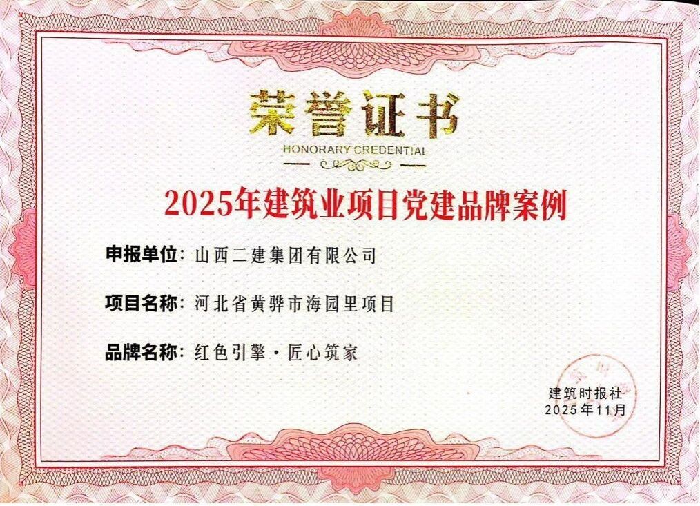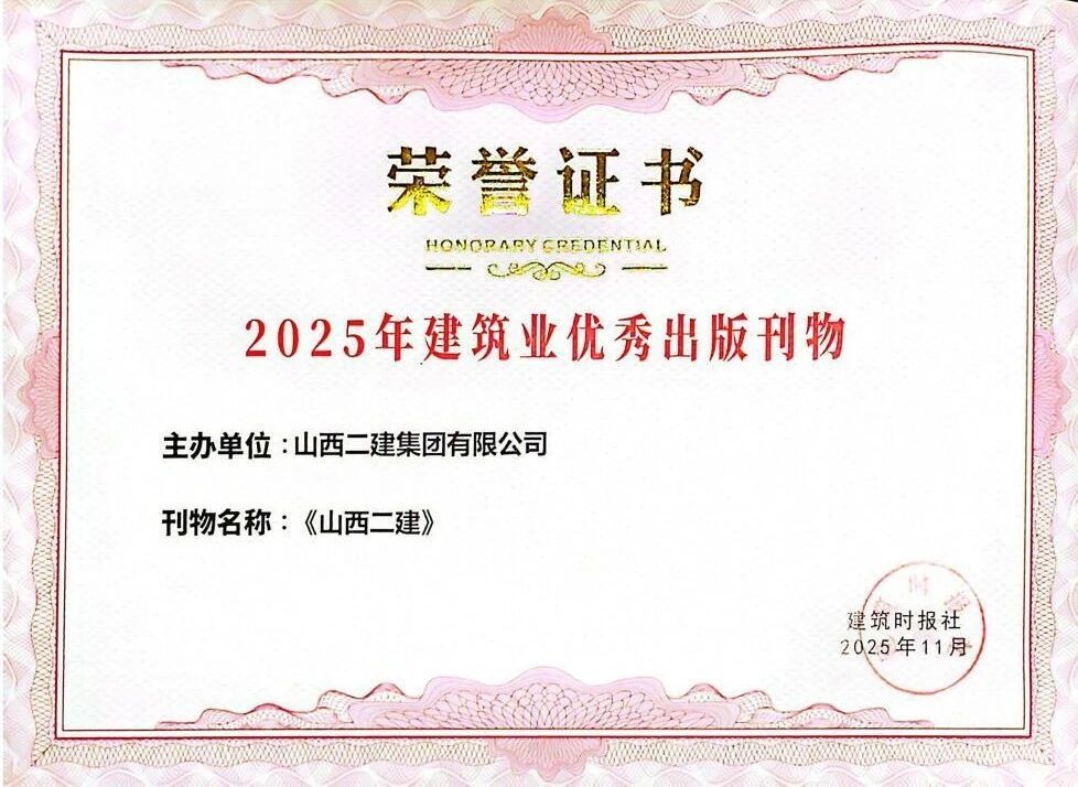 在中国企业文化研究会主办的2025年中外企业文化峰会上,二建集团申报的《守正创新铸魂强基:以“党员先锋队”为载体推动党建文化与高质量发展深度融合实践》成果获评典型案例;在2025年建筑业企业文化成果发布会暨建筑时报社全国通联工作会议上,宣传期刊《山西二建》获评“2025年建筑业优秀出版刊物”;《以文化铸魂以实干筑梦——以文化软实力驱动高质量发展》入选2025年度企业文化传播案例;河北黄骅市海园里项目《红色引擎·匠心筑家》获评2025年度建筑业项目党建品牌案例;在中国施工企业管理协会2025年工程建设企业文化成果评选中,《山西二建》期刊、二建集团微信公众号分别荣获一等成果和二等成果。
