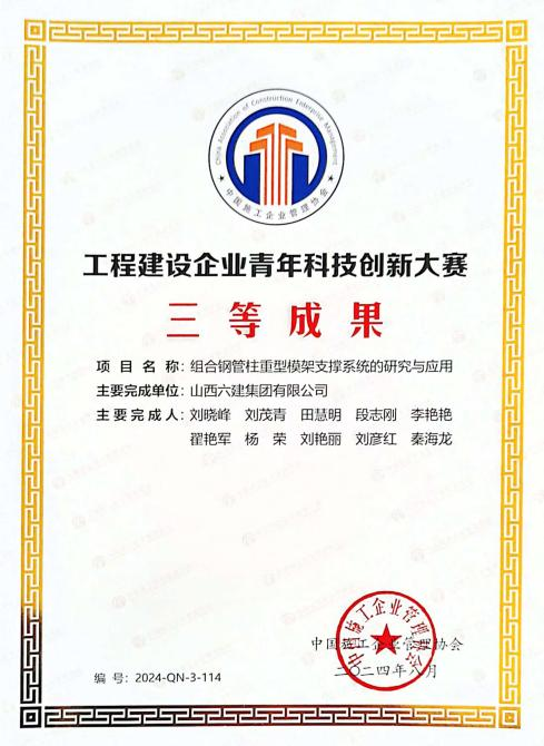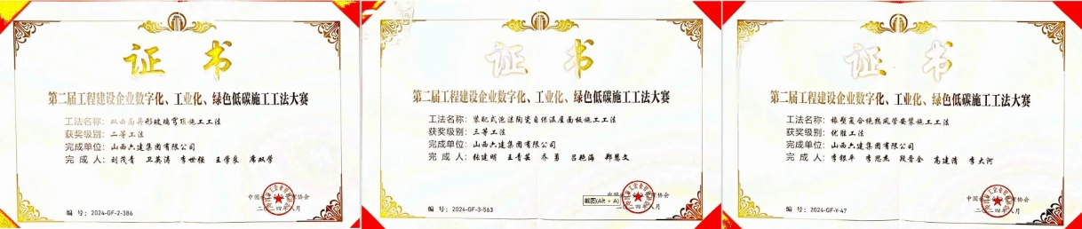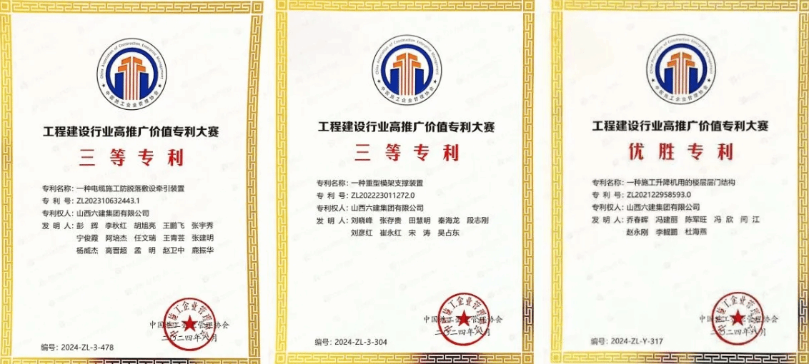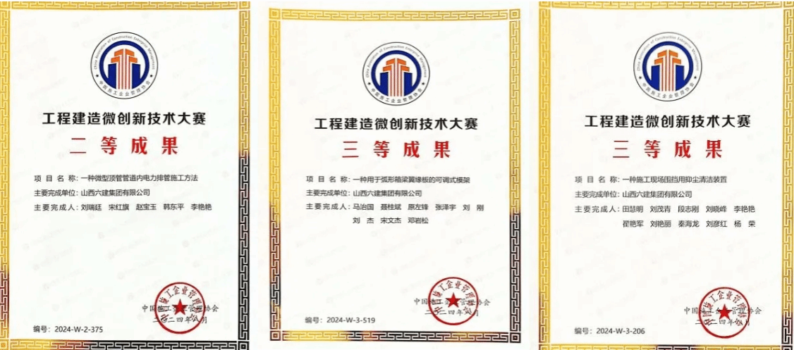 大赛结果中,山西建投六建集团申报的《一种微型顶管管道内电力排管施工方法》《一种用于弧形箱梁翼缘板的可调式模架》《一种施工现场围挡用抑尘清洁装置》分别获得工程建造微创新技术大赛二等奖、三等奖,《一种电缆施工防脱落敷设牵引装置》《一种重型模架支撑装置》《一种施工升降机用的楼层层门结构》分别获得工程建设行业高推广价值专利大赛三等奖和优胜奖,《双曲面异形玻璃穹顶施工工法》《装配式泡沫陶瓷自保温屋面板施工工法》《橡塑复合绝热风管安装施工工法》分别获得工程建设企业“数字化、工业化、绿色低碳”施工工法大赛二等奖、三等奖和优胜奖;《组合钢管柱重型模架支撑系统的研究与应用》获得首届工程建设企业青年科技创新大赛三等奖。